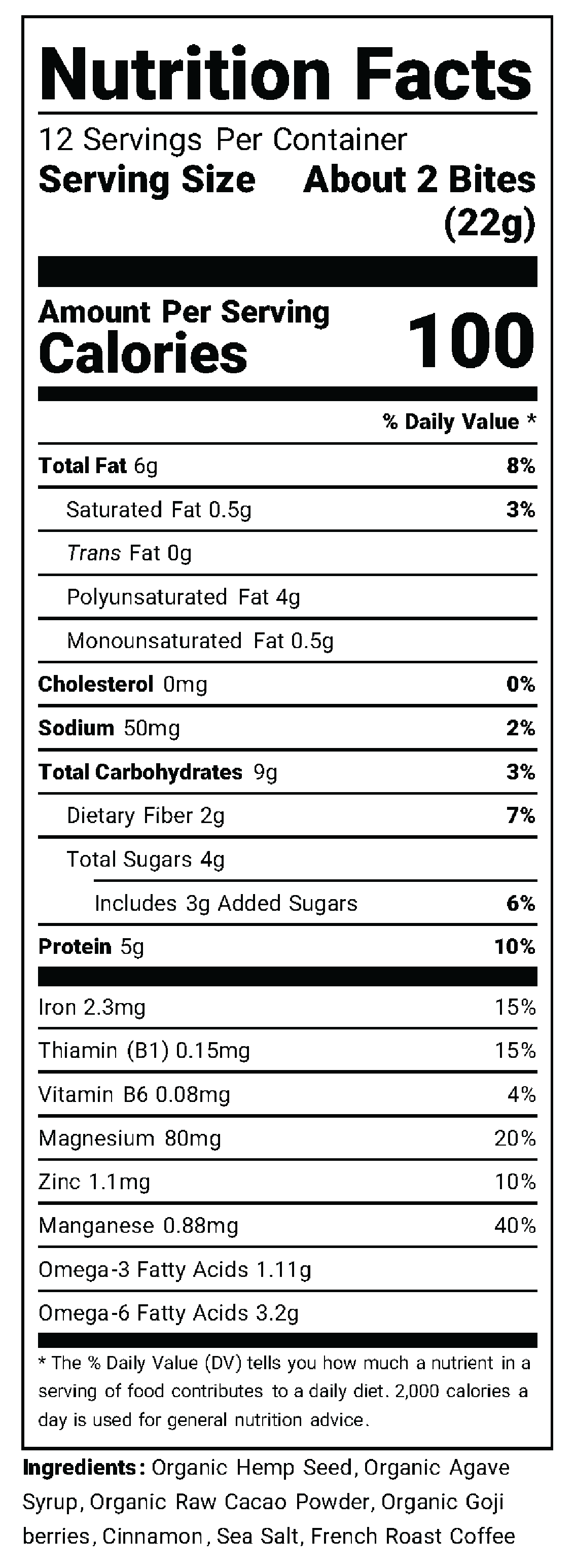 Hemp seeds, Agave, Kosher salt, Cacao Powder, Chopped dates, French Roast Coffee, Toasted Sesame Seeds