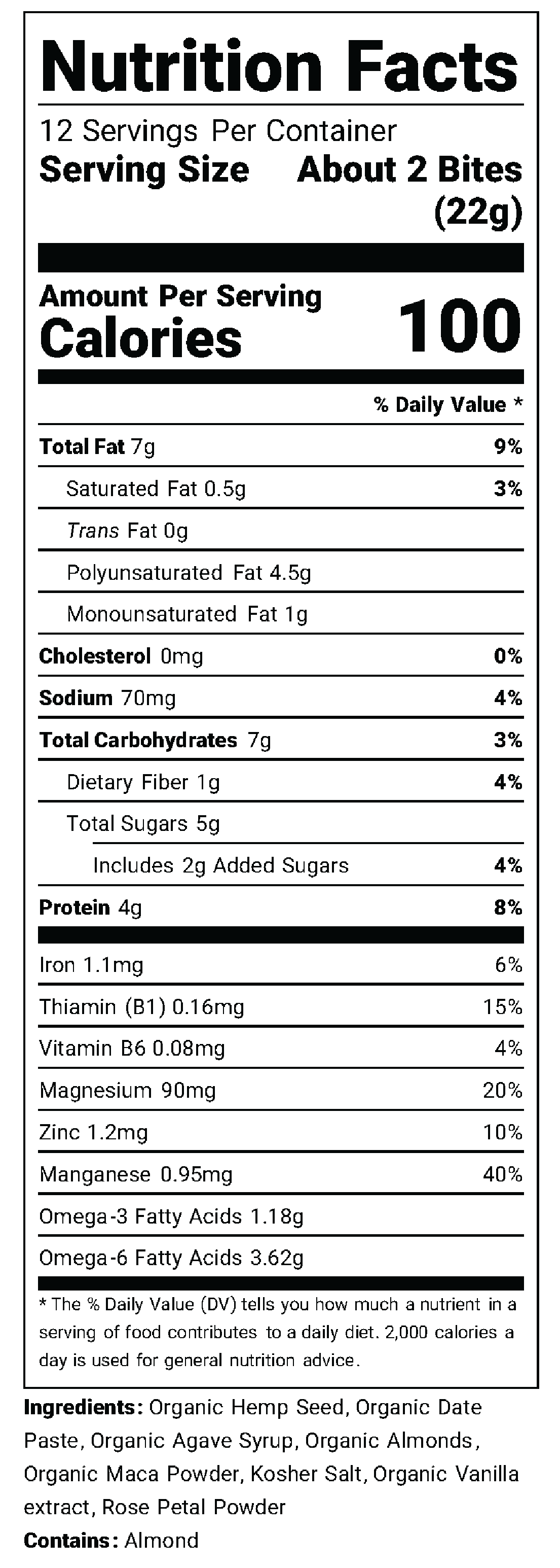 Hemp seeds, Agave, Kosher salt, Maca powder, Chopped dates, Pure vanilla extract, Toasted Almonds, Rose Petals